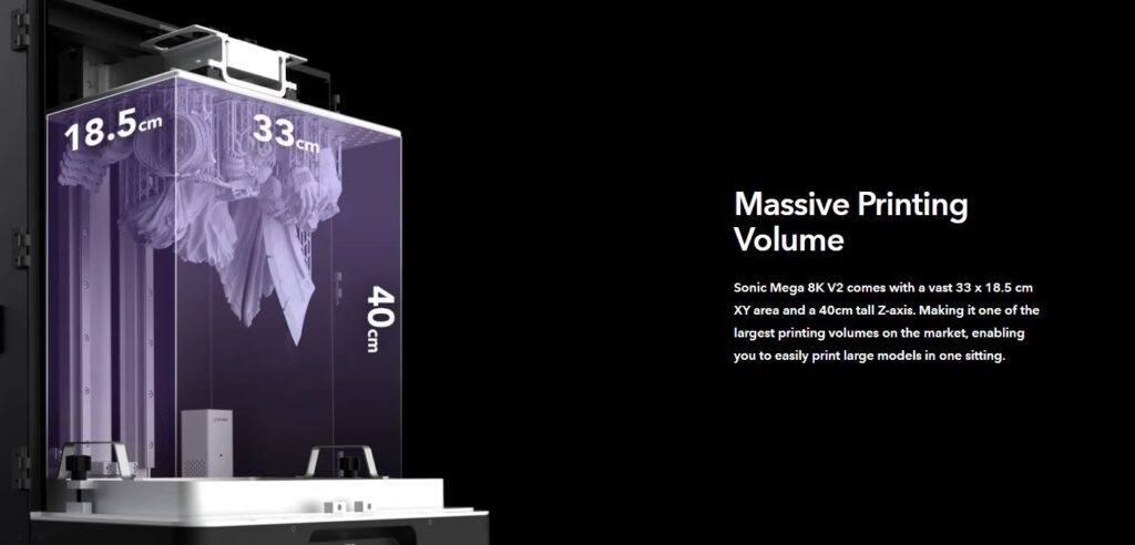 With a build space of 330 x 185 x 400 mm, the Sonic Mega 8K V2 is one of the largest LCD 3D printers on the market. With the large build volume, large-format 3D models and prototypes are brought to life in no time.